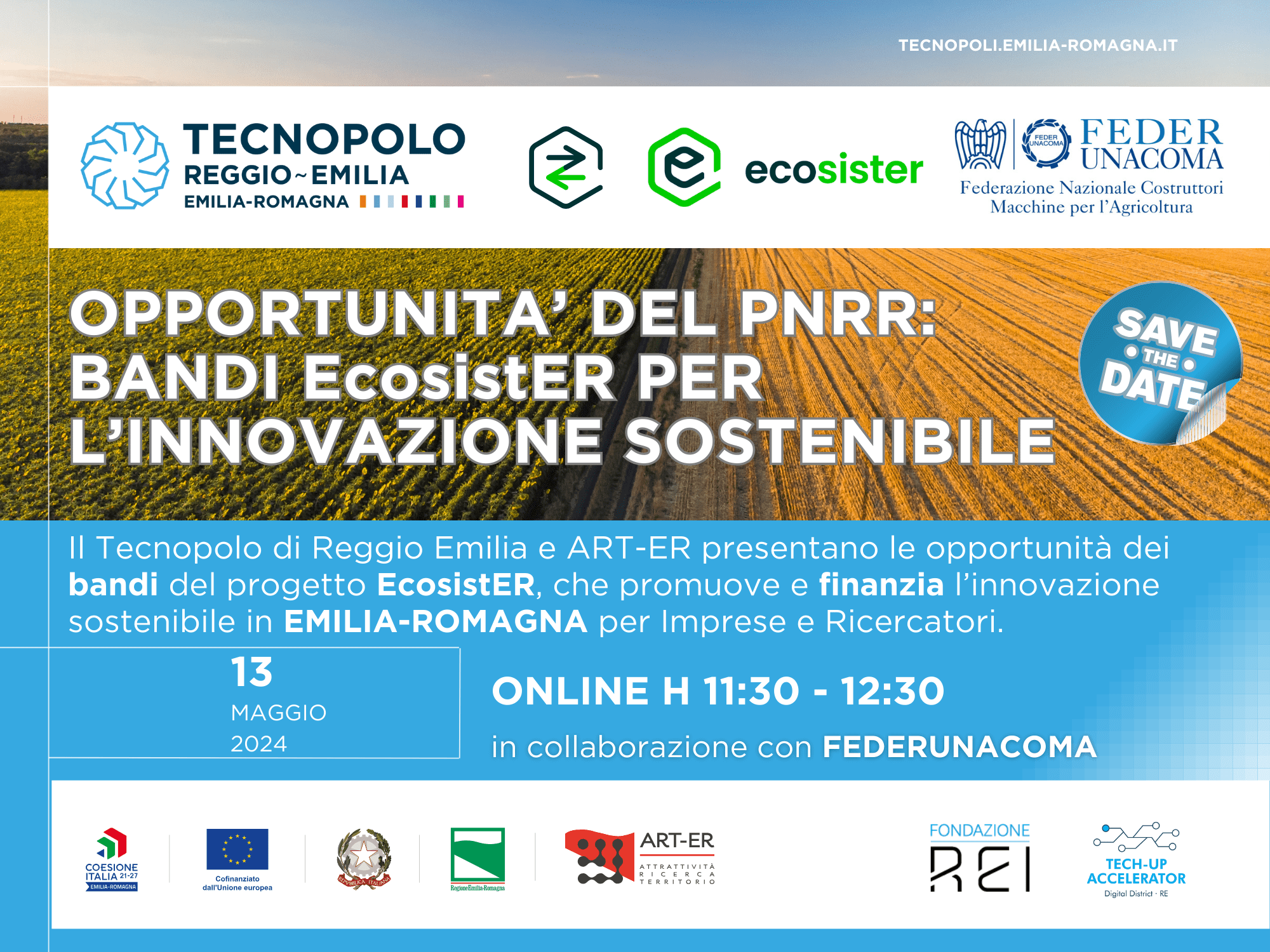 Ancora un appuntamento, questa volta organizzato dal Tecnopolo di Reggio Emilia e ART-ER in collaborazione con Federunacoma, per conoscere le opportunità dei bandi EcosistER per le imprese dell’Emilia-Romagna e per confrontarsi direttamente con i promotori dei bandi e i laboratori affiliati del progetto. Le iniziative rientrano all’interno del pillar sul Trasferimento Tecnologico TTIP: