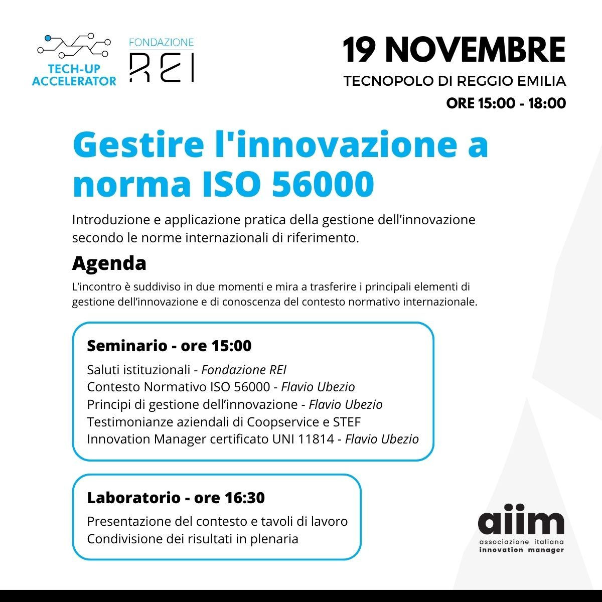 Il 19 Novembre 2024, presso il Tecnopolo di Reggio Emilia, si terrà l'evento Gestire l'Innovazione a Norma ISO 56000, organizzato dall'Associazione Italiana Innovation Manager in collaborazione con Fondazione REI.