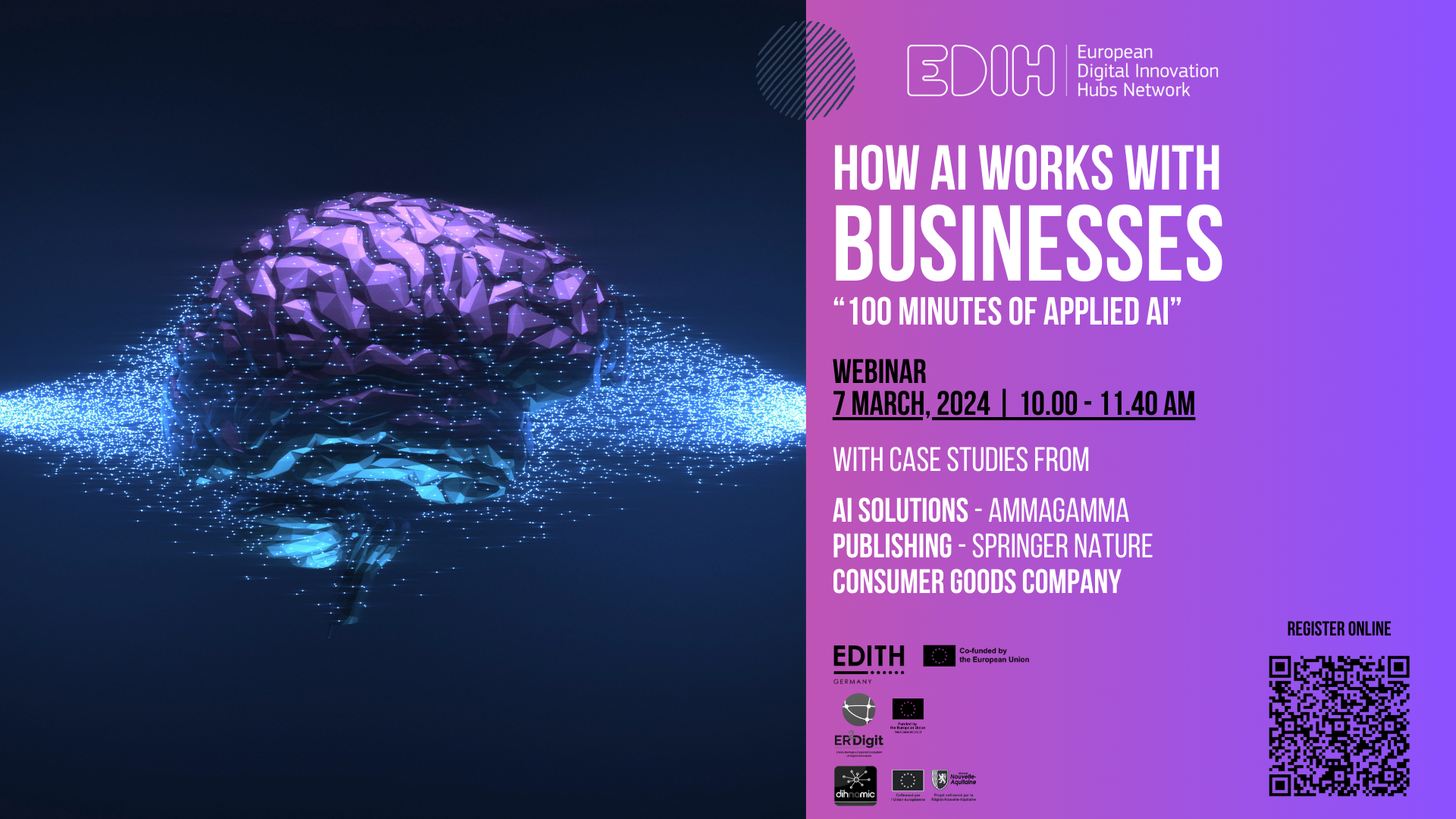 Come utilizzare l'AI in contesti aziendali innovativi? Il webinar internazionale "How AI works with business" affronta la discussione insieme ai rappresentati di aziende attive nelle regioni di riferimento di tre European Digital Innovation Hubs: EDITH in Assia (DE), DIHNAMIC in Nouvelle-Aquitaine (FR) ed ER2Digit in Emilia-Romagna (IT).