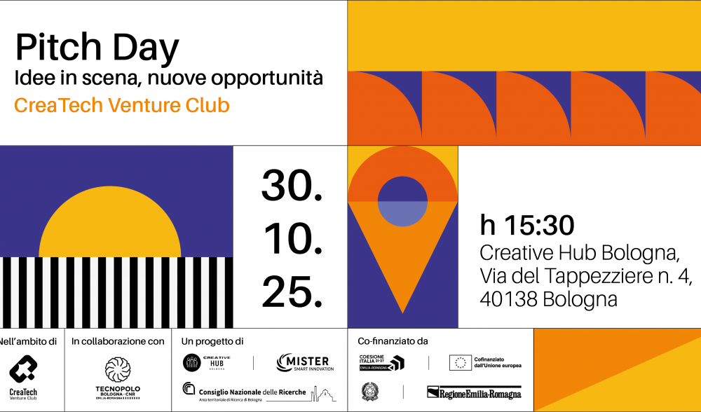 L’evento conclusivo del progetto CreaTech Venture Club, “Pitch Day: idee in scena, nuove opportunità” si terrà giovedì 30 ottobre a partire dalle ore 15:30 presso Creative Hub Bologna (Via del Tappezziere, 4, Bologna).